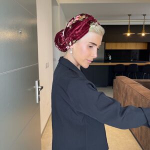 טורבן קטיפה פרחוני בורדו עם גומייה תואמת