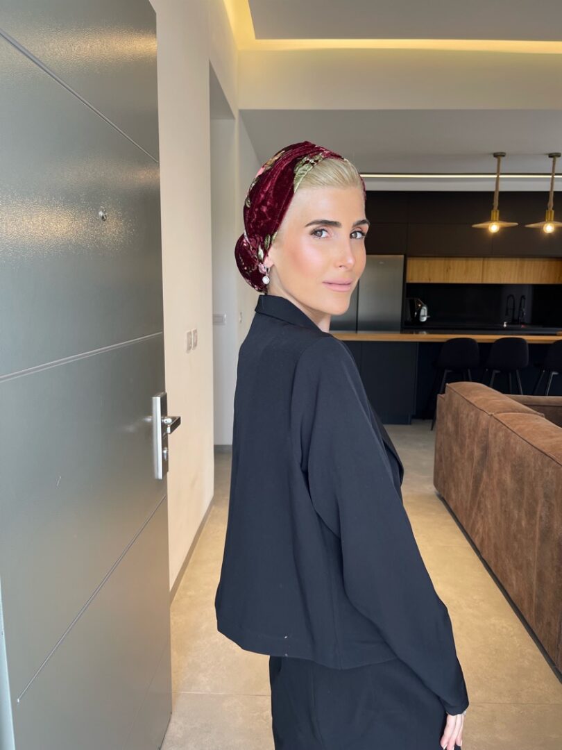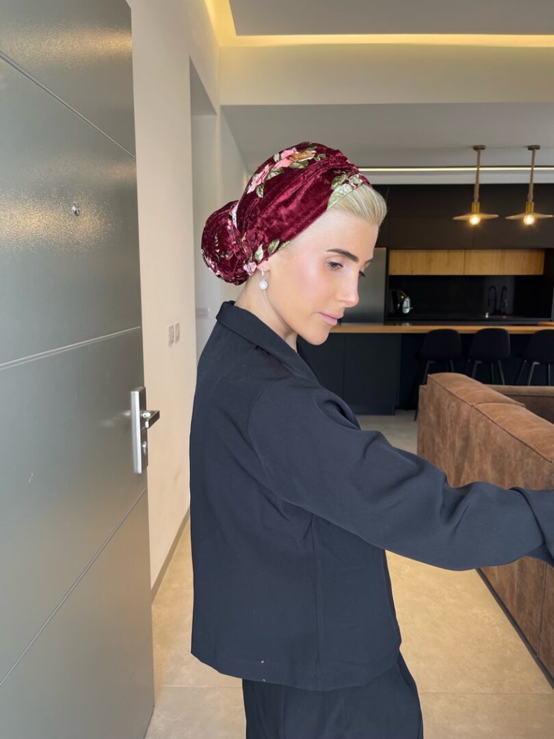 טורבן קטיפה פרחוני בורדו עם גומייה תואמת